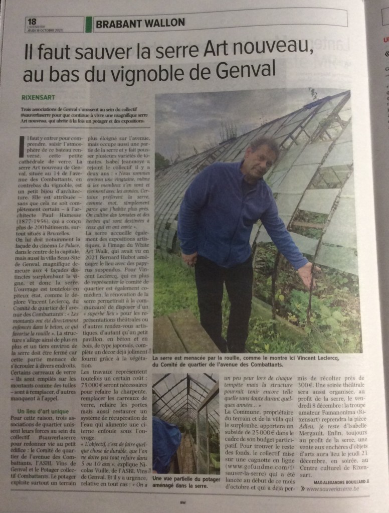 L’Avenir a consacré une très belle page au projet de restauration de la serre. « Il faut sauver la serre Art nouveau, au bas du vignoble de Genval », a titré le journal dans son édition du 18 octobre dernier.